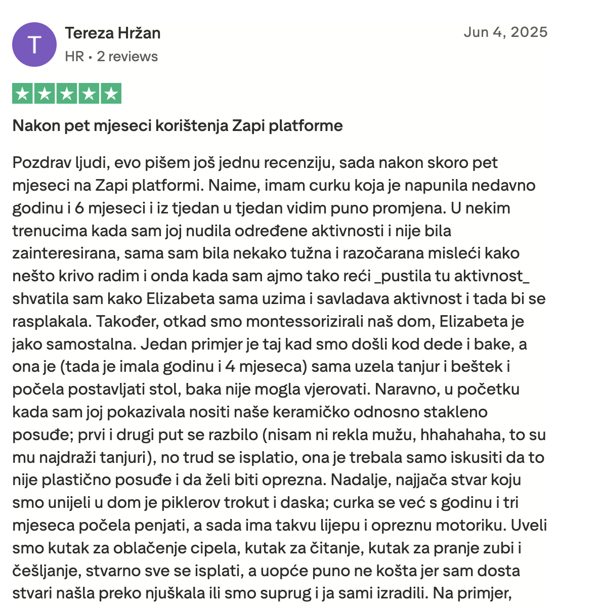 Umjesto da djeca provode sate na izvanškolskim aktivnostima ili ekranima, Zapi omogućuje da učite i da se razvijate zajedno, u opuštenom okruženju vašeg doma.